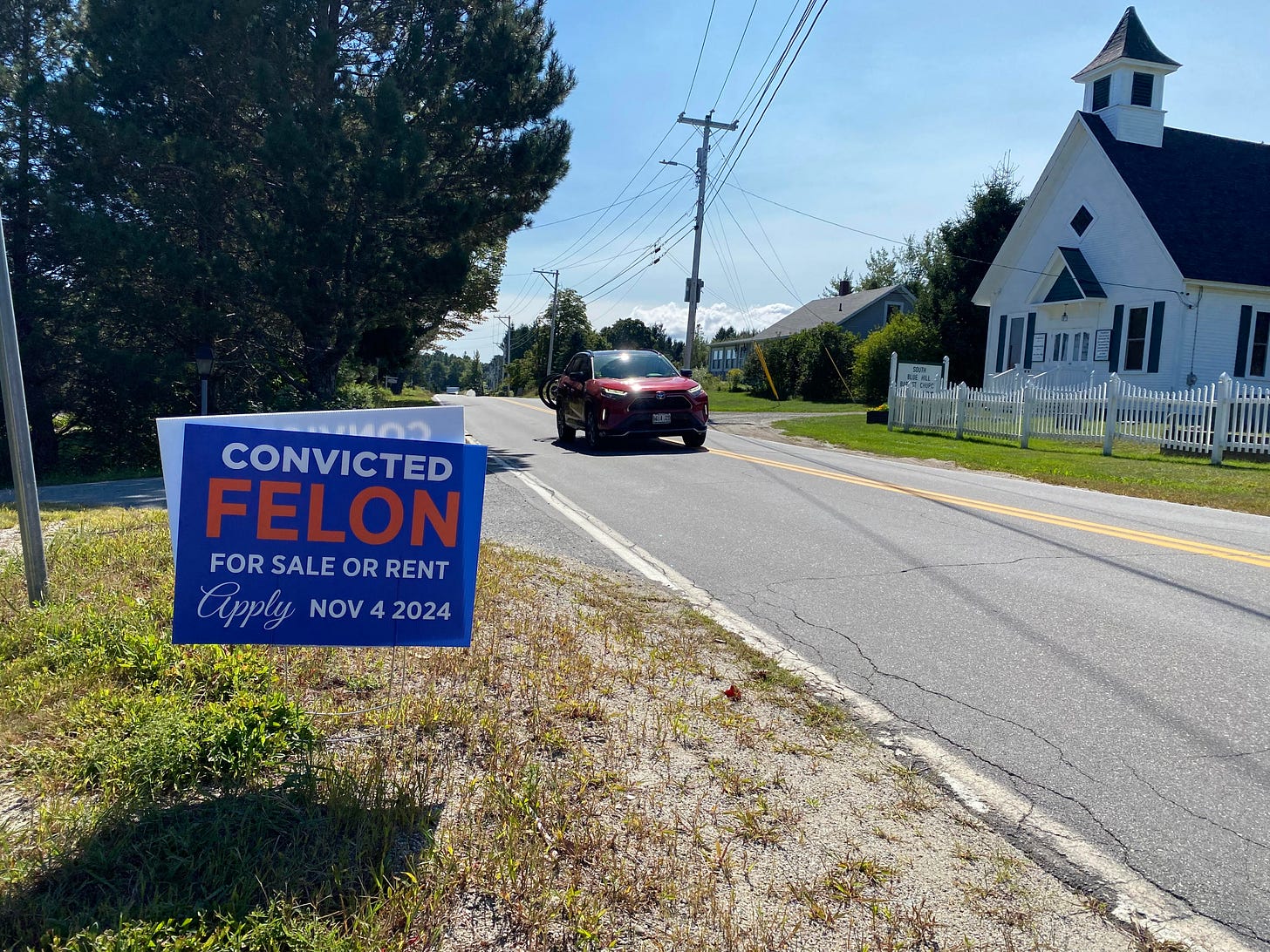 Whatever the final straw, in response to a TRUMP 2024 lawn sign near his home last week, Noel ordered 10 signs (shown above) complete with the required wire stands for lawn placement to position directly across the street from the Trump sign and at other strategic spots in the neighborhood in an attempt to balance the local messaging from the Trump campaign.